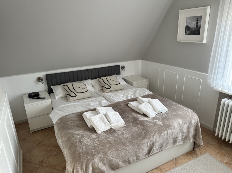 Schlafzimmer: Doppelbett, Flachbild-TV, Kleiderschrank, Bettwäsche, Nachtschränkchen, Safe, Bügeleisen und -brett.