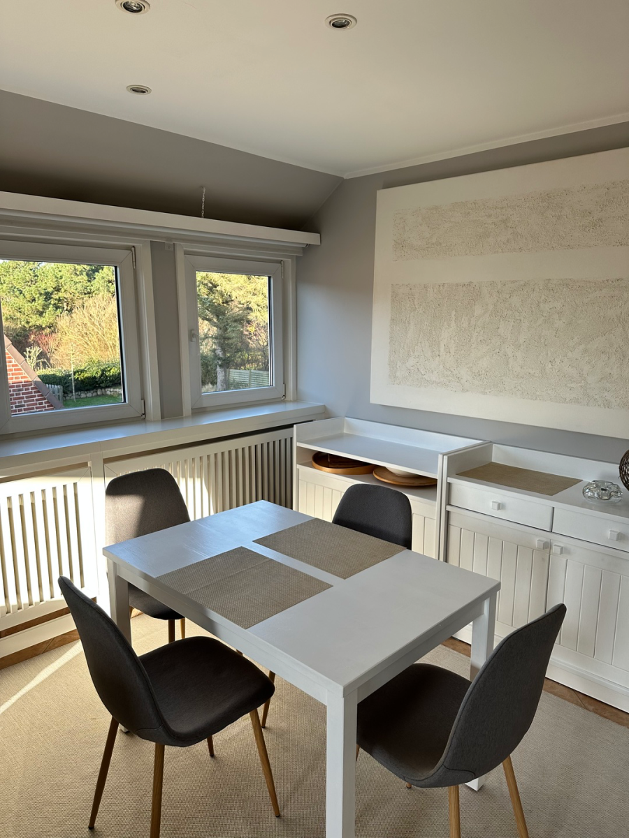Küche: 4-Platten-E-Herd, Mikrowelle, Spüle, Kühlschrank, Spülmaschine.