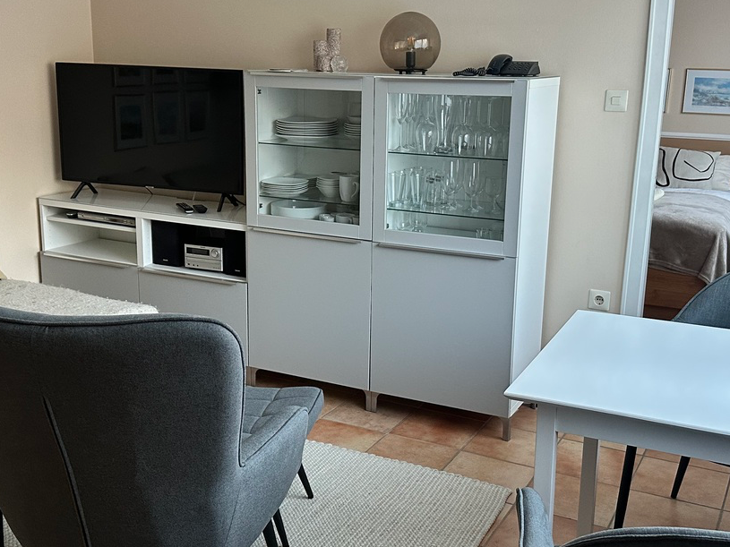Wohnzimmer: Schlafcouch, Essplatz, div. Wohnmöbel, Smart-TV, DVD, Stereoanlage, Telefon und W-Lan .